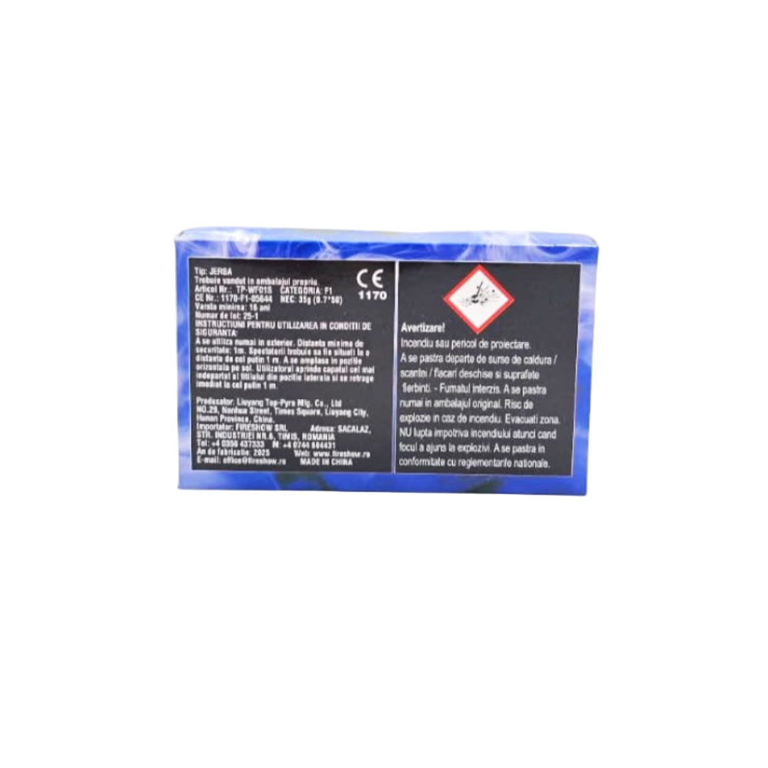 Jerbă pirotehnică SCREAM S TP-WF015, categorie F1, conține 35 g de compoziție pirotehnică (0,7 × 50). Destinată uzului exterior, pentru persoane peste 16 ani. Asigură-te că o plasezi pe o suprafață stabilă și păstrează o distanță de siguranță de minimum 1 metru.